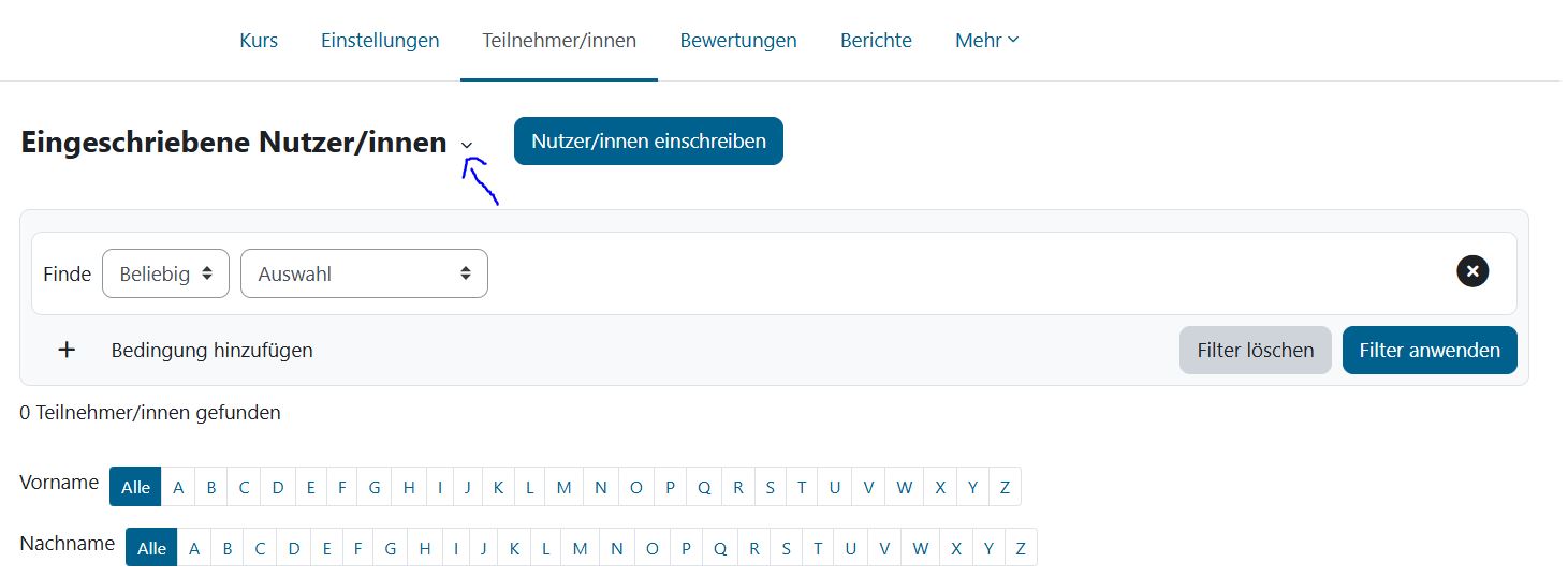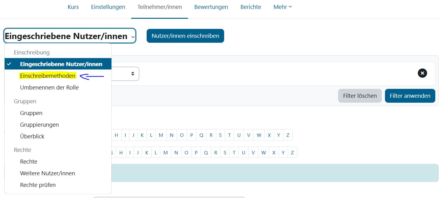 Moodle stellt verschiedene Möglichkeiten bereit, wie Nutzer*innen in einen Kurs gelangen. Um Einstellung vorzunehmen, stellen Sie bitte oben rechts den „Bearbeitungsmodus” an. Klicken Sie unter Ihrem Kurstitel auf „Teilnehmer*innen”. Sobald Sie auf „Eingeschriebene Nutzer/innen” klicken, öffnet sich ein Dropdown-Menü. Wählen Sie hier „Einschreibemethoden” aus. Nun haben Sie die unten beschriebenen Möglichkeiten zur Auswahl.
