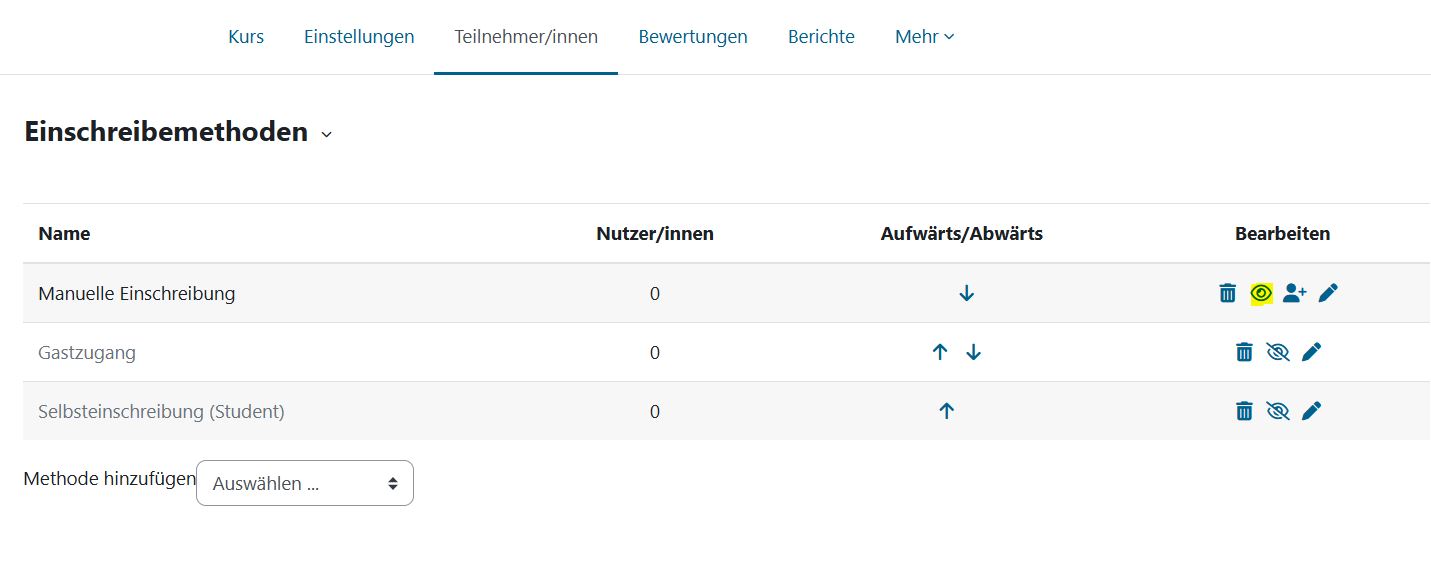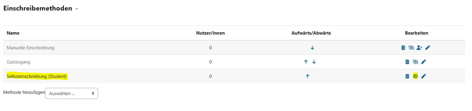 Nutzer/innen können sich selbst in den Kurs einschreiben. Die Selbsteinschreibung (mit oder ohne Einschreibeschlüssel) ist eine Einschreibemethode, bei der Nutzer*innen sich selbst in einem Kurs anmelden können. Stellen Sie sicher, dass in der Tabelle bei der Einschreibemethode Selbsteinschreibung (Teilnehmer/in) das Auge-Symbol geöffnet ist.